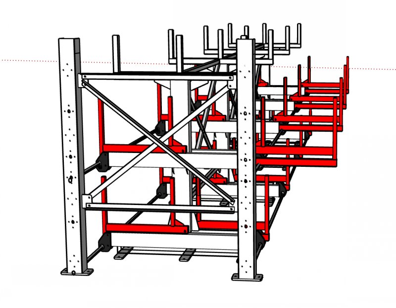 懸臂式貨架尺寸 高度:4000mm 長度:5600mm 寬度:1560mm 懸臂:100%伸縮 雙面懸臂 層數:5層 承重:1000~5000kg 非標可定做
